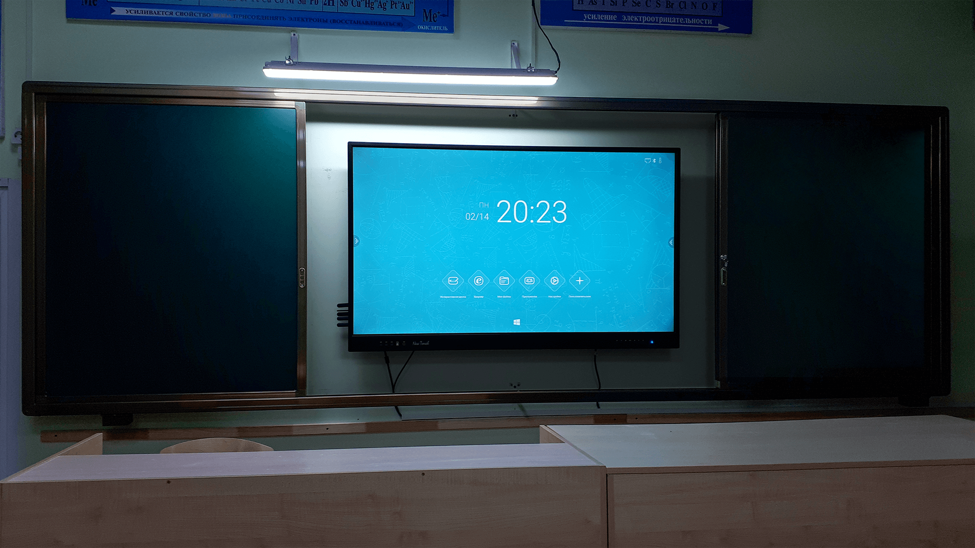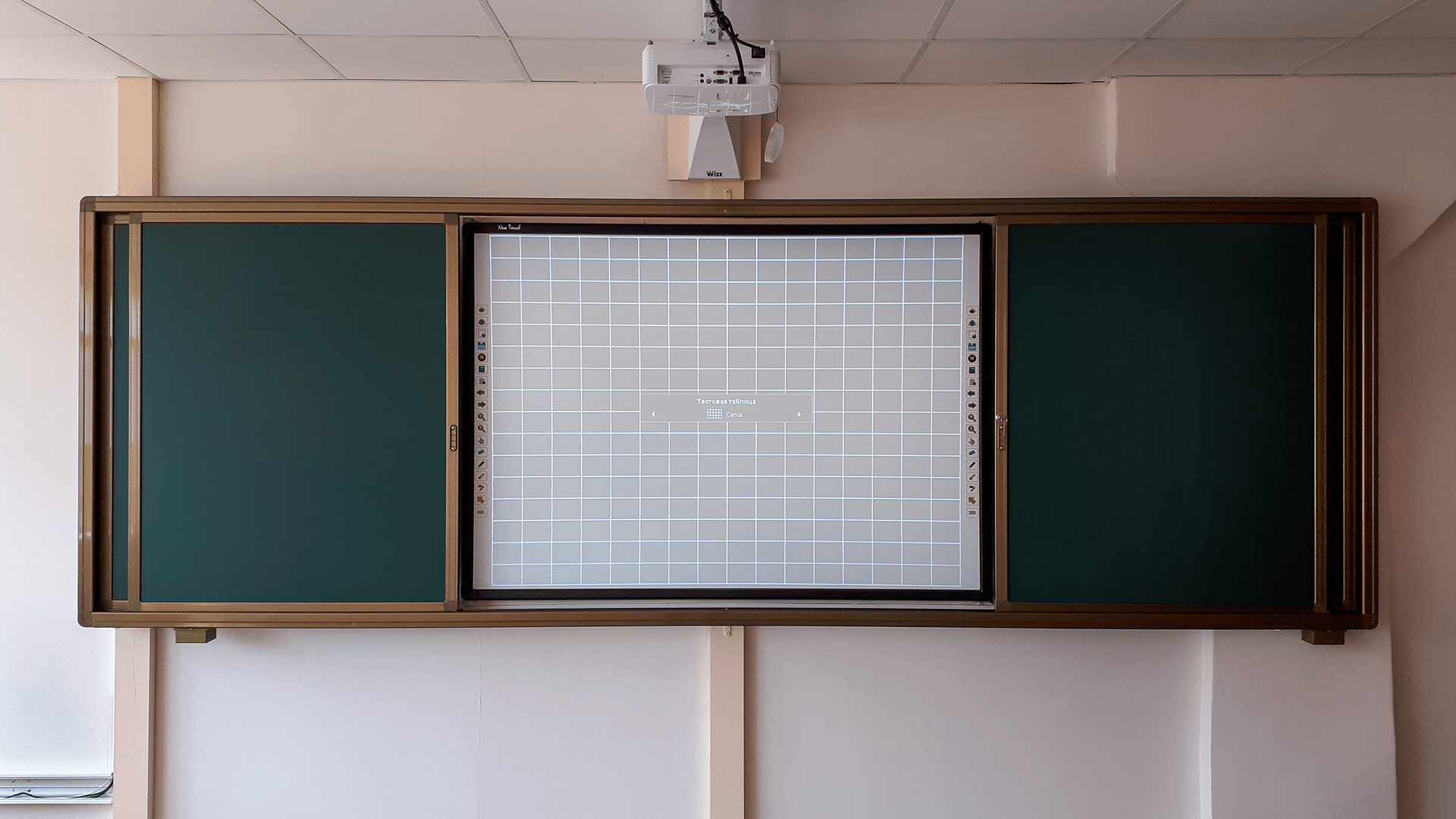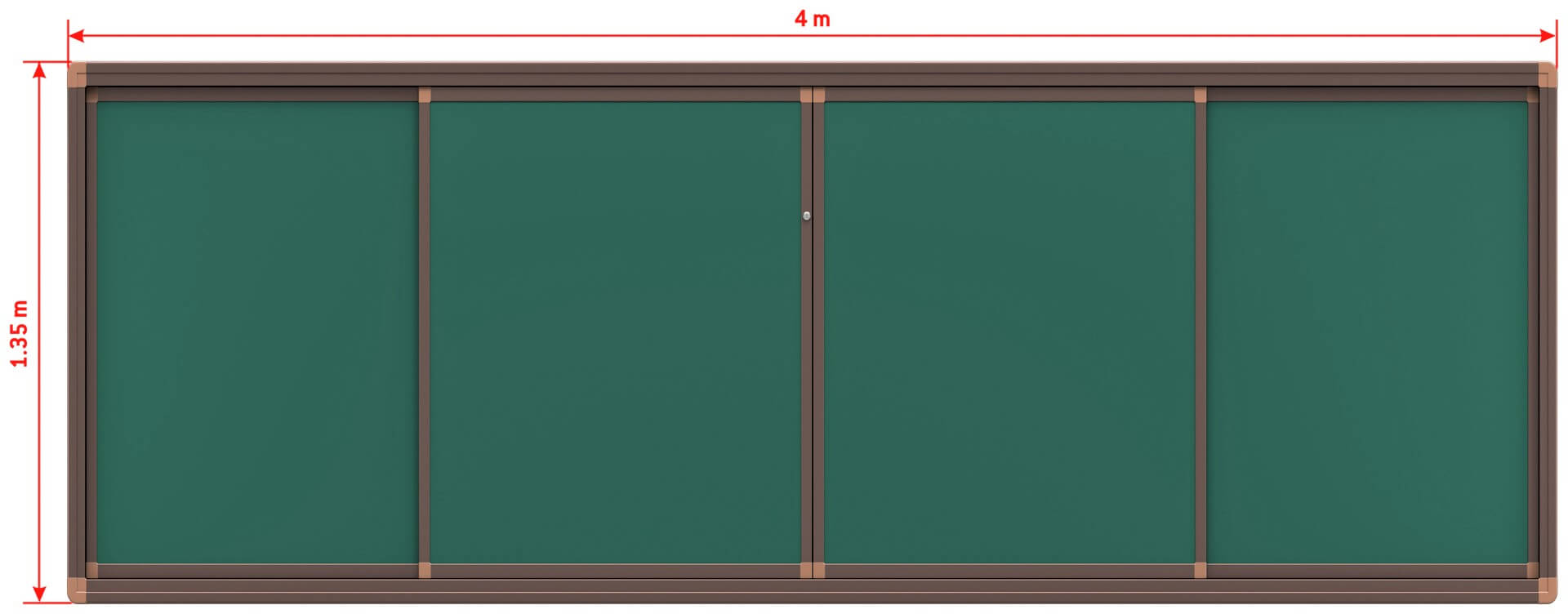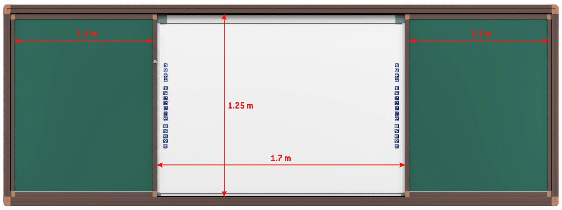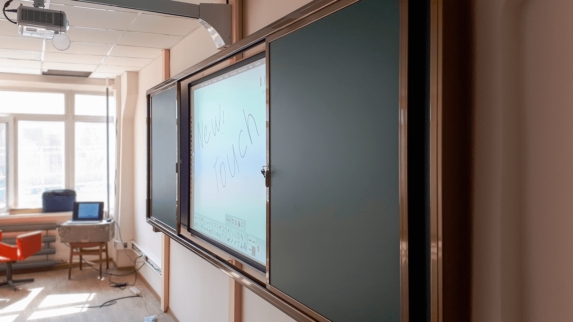 Раздвижная меловая доска – это универсальная система, состоящая из четырёх магнитно-меловых поверхностей и специальной ниши для установки интерактивной доски с диагональю не более 82 дюймов либо интерактивной панели с диагональю не более 75 дюймов.