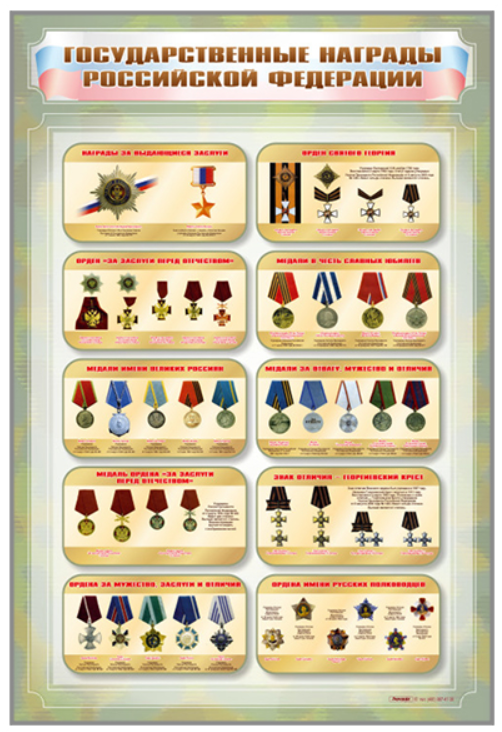 Стенд представляет собой информационную панель, на которой размещены государственные награды Российской Федерации.